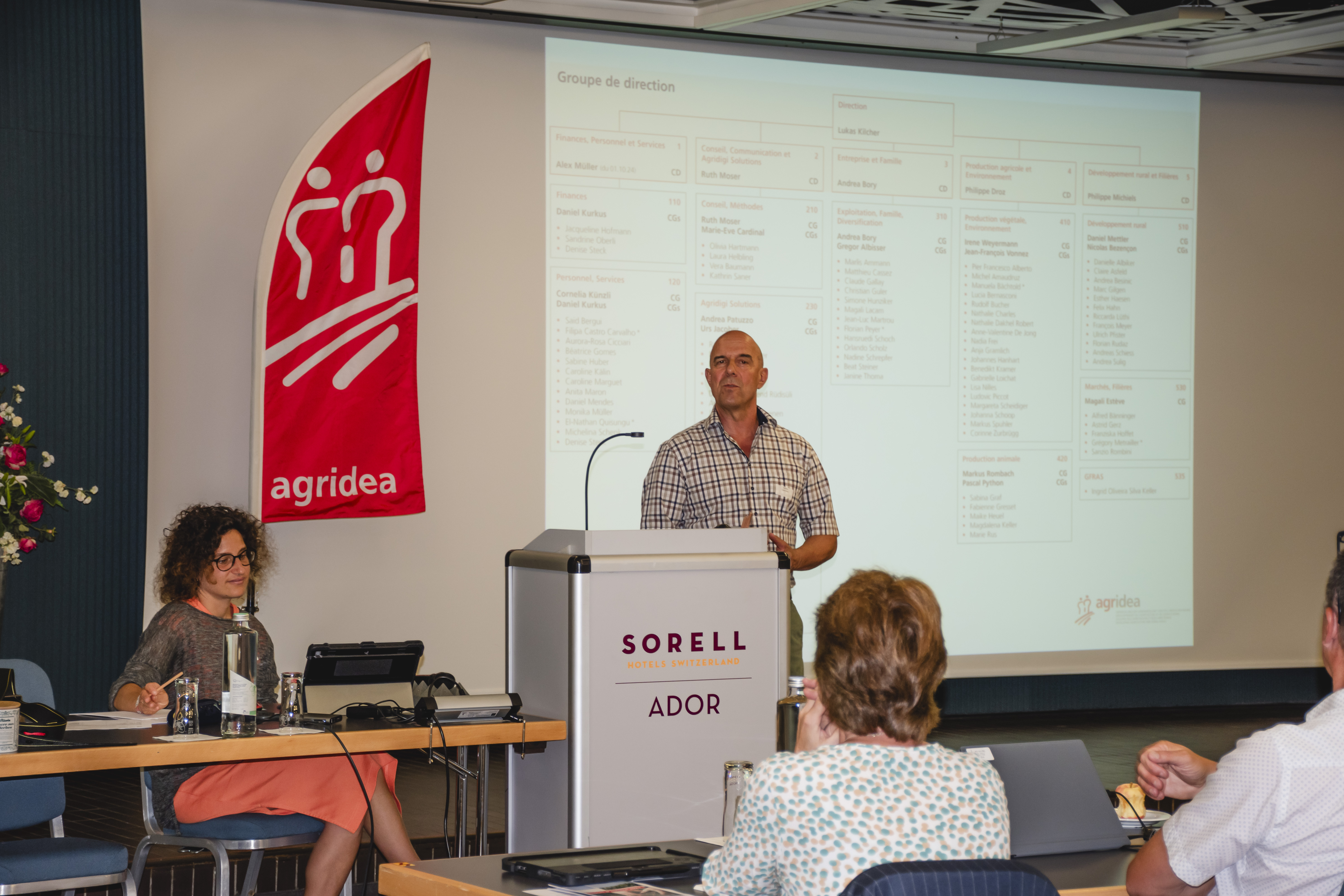 Le 20 juin, AGRIDEA a présenté ses travaux prioritaires actuels et futurs. Parmi la cinquantaine de personnes présentes se trouvaient des représentant-te-s des cantons et d’organisations membres ainsi que des conseiller-ère-s d'État, membres de la Conférence des directeur-trice-s cantonaux-ales de l'agriculture (CDCA). L'association remplit sa mission avec succès en transmettant des connaissances pertinentes et pratiques, en favorisant la collaboration interdisciplinaire et en créant des solutions efficaces pour la vulgarisation agricole, la formation, la pratique et l'administration. Lukas Kilcher, directeur d'AGRIDEA depuis début 2024, est fier des accomplissements de ses équipes : « En tant que plaque tournante indépendante de la connaissance, nous voulons résolument promouvoir et contribuer au développement durable de l'ensemble des filières agricoles, de la production au marché. Pour ce faire, nous restons toujours à l'écoute des tendances et des changements, en misant autant sur le renouveau que sur la continuité ».