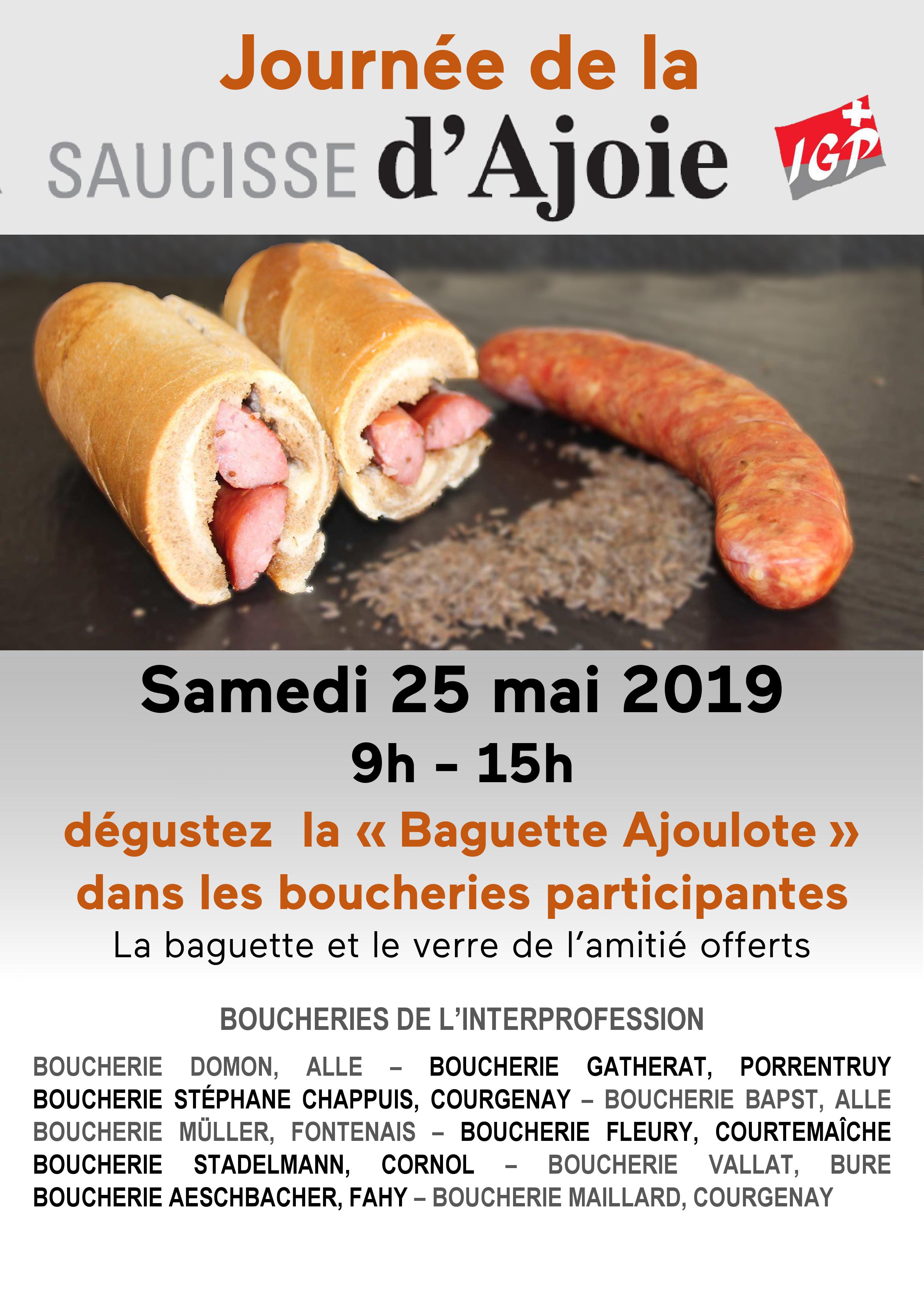 De 9h à 15, le 25 mai, le public pourra déguster dans 10 boucheries artisanales du district de Porrentruy la saucisse sous ses 3 formes, ainsi que grillée dans la «Baguette Ajoulote» bicolore. Et rien de tel qu’un verre de l’amitié offert pour accompagner votre dégustation!