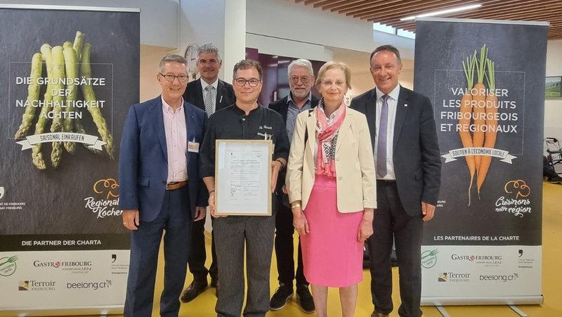 Le 18 juin 2021, le Conseil d’Etat présentait la démarche « Cuisinons notre région » et sa Charte. Pour rappel, celle-ci est portée par la Direction des institutions, de l’agriculture et des forêts (DIAF), la Direction du développement territorial, des infrastructures, de la mobilité et de l’environnement (DIME) et la Direction de la santé et des affaires sociales (DSAS). Elle est accompagnée par les parties prenantes que sont l’Association Terroir Fribourg, Fourchette verte Fribourg, GastroFribourg, Grangeneuve et Beelong, qui soutiennent les établissements partenaires dans la mise en œuvre de la Charte.