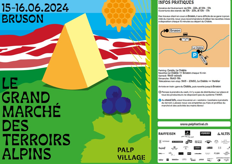 Aux côtés des stands qui parsèmeront les ruelles du petit village encore si authentique de Bruson, le Grand Marché des Terroirs proposera une multitude d’animations : conférences sur l’agriculture de montagne et les produits du terroir de demain, masterclass sur les cépages endémiques alpins, dégustations champêtres et de bières, ateliers de contes, chasse aux trésors, roulotte-cuisine, jeux en bois, confection de merveilles, espace de littérature alpine et bien sûr un large éventail de concerts de yodel, de blues, de jazz, de polp folk, de swing et de chants parce qu’avec le PALP Festival, c’est toujours un hymne festif au terroir et à la musique !