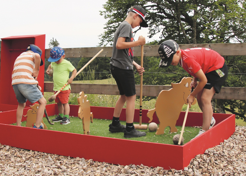 S’amuser en famille : le jeu de croquet « Vache-taureau-veau » permet d’apprendre ce que mangent les vaches mères.