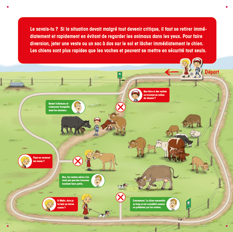 En plus des postes ludiques de Vache mère Suisse, les promeneurs·euses trouveront également des panneaux d’information du Service de prévention des accidents dans l’agriculture (SPAA), conçus avec beaucoup d’originalité. Ils indiquent le comportement à adopter lorsqu’on rencontre un troupeau de vaches au cours d'une randonnée. On y apprend par exemple qu’il ne faut pas caresser les veaux et que les chiens doivent être tenus en laisse courte. En effet, le chien ressemble au loup et est considéré comme un prédateur par les vaches. Le sentier découverte traverse peu de pâturages. Il est ainsi tout à fait possible de se promener avec son chien afin d’apprendre les règles pour de futures randonnées. Pour conclure, ce sentier vaut le détour et vous transmettra des connaissances passionnantes sur l’élevage allaitant.