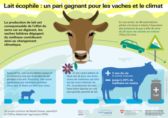 Dans le cadre du projet «lait écophile», financé par un partenariat public-privé entre Nestlé Suisse et l’Office fédéral de l’agriculture (OFAG), Nestlé s’engage avec désormais 145 exploitations agricoles de l’organisation de producteurs de lait aaremilch AG à favoriser une économie laitière durable. D’ici 2020, le projet «lait écophile» devrait permettre d’économiser près de 50 grammes d’équivalent CO2 par kilo de lait, soit une réduction de 10%., précise le communiqué.