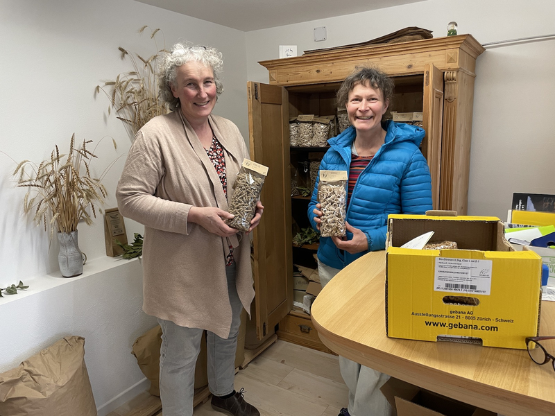 Une fois par semaine, Danielle Rouiller et Valérie Thiébaut se retrouvent à Chaumont (NE), à mi-chemin de leurs exploitations, pour s’échanger des pâtes… et en vendre chacune de leur côté. Ces deux agricultrices, l’une basée à Cernier, l’autre à Lignières, à 1'000 mètres d’altitude, se sont associées en 2016, avec une même idée en tête: valoriser la production de leurs céréales. Il en est né "Aux mille pâtes", un nom clin d’œil à la grande diversité de pâtes artisanales qu’elles fabriquent dans leurs ateliers respectifs, et à leur souci de contribuer au bien-être de la biodiversité.
