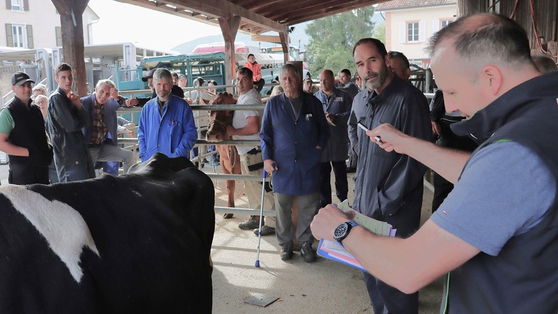 Ici les agriculteurs ont rassemblé leurs bêtes à partir de 7h30, et à partir de 8h15 le Service jurassien de l’économie rurale et le directeur d’Agrijura assurent le contrôle des papiers, notamment la traçabilité sanitaire de l’animal, à jour, dans la BDTA, la Banque de données sur le trafic des animaux. Une fois le bovin passé sur la balance, des experts de Proviande établissent son prix plancher, se basant sur une grille de tarifs de référence, entendue par label (AQ-Viande, IP-Suisse, Bio) et communiquée tous les 15 jours. Pour ce faire, ils scrutent l’état de santé, la charnure, la graisse, l’évolution en fonction de l’âge. Puis c’est au tour du commissaire-priseur d’arbitrer les enchères.