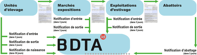 Avant l’entrée en vigueur de l’enregistrement obligatoire dans la BDTA, un groupe de soutien conduit par l’Office fédéral de la sécurité alimentaire et des affaires vétérinaires (OSAV) veille à ce que l’enregistrement et le marquage obligatoires soient réalisables en pratique. En font partie l’Office fédéral de l’agriculture (OFAG), l’exploitant de la BDTA Identitas SA, les vétérinaires cantonaux, les détenteurs d’animaux, les organisations d’élevage, le commerce de bétail, les abattoirs, les organisations de production sous label et le service consultatif et sanitaire en matière d’élevage de petits ruminants (SSPR).