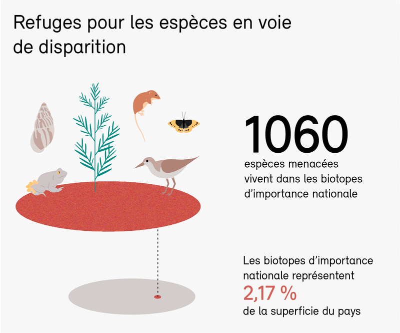 La plupart du temps, ajoute le dossier, les biotopes d’importance nationale se distinguent considérablement du reste du paysage et constituent des refuges pour toutes les espèces tributaires des conditions particulières qu’offrent ces habitats. «Ils contribuent à la diversité, aux couleurs et à l’attrait de la Suisse et permettent au pays de mieux résister aux atteintes environnementales causées, par exemple, par les changements climatiques». Ces biotopes, note encore l’OFEV, représentent également les aires centrales de l’infrastructure écologique, un réseau national de milieux naturels précieux sur le plan écologique appelé à être développé au cours des années à venir.