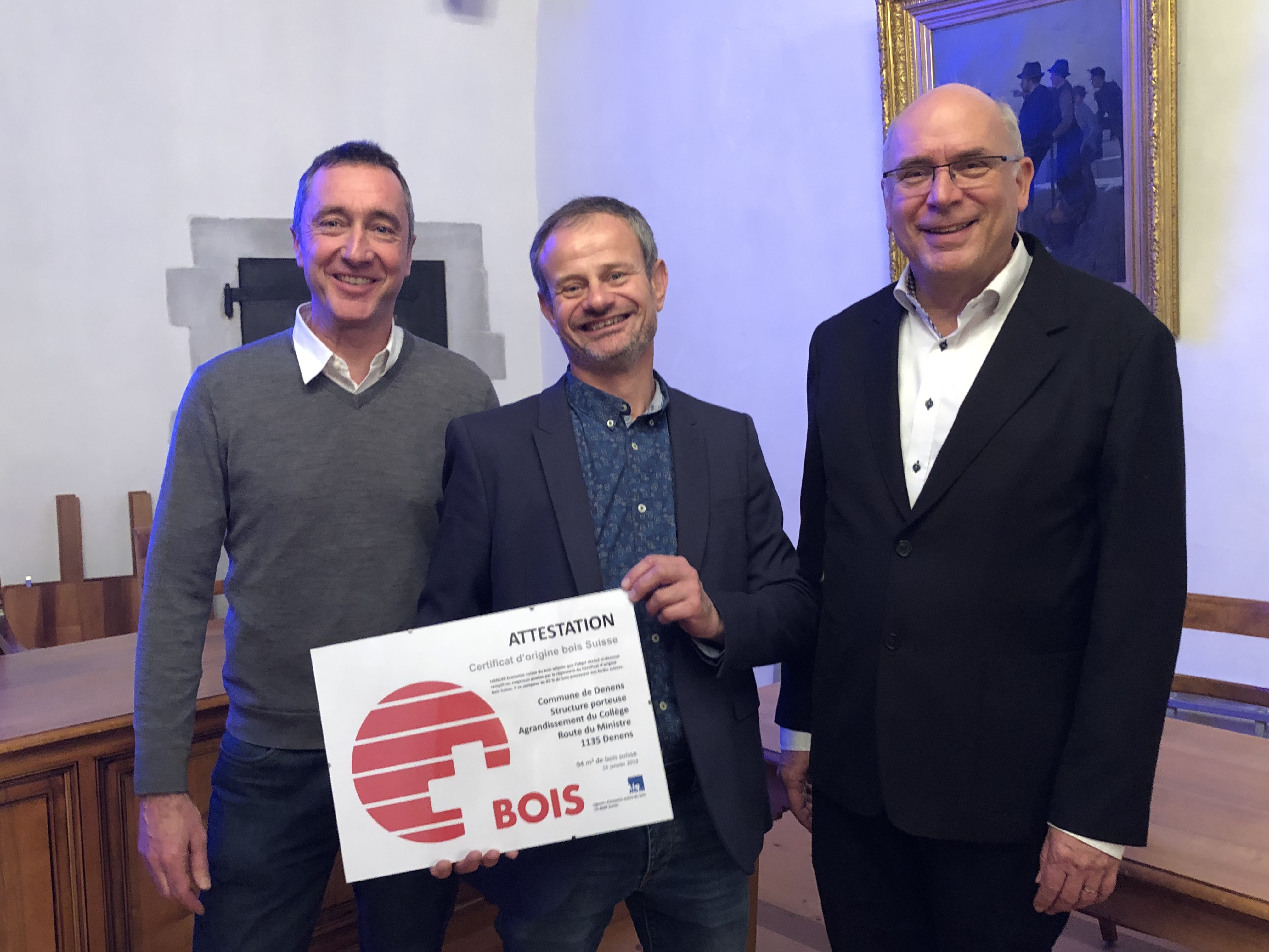 Ainsi, à l’occasion du Rendez-vous du bois sur la thématique «Construire en bois suisse dans le cadre des marchés publics» qui a eu lieu jeudi 17 janvier à Rolle (VD), le label Certificat d’origine bois Suisse a été décerné à la commune de Denens pour la structure de l’agrandissement de son collège. «Les communes sont pour la plupart à la fois productrices de bois et maîtres de l’ouvrage. Elles ont un rôle d’exemplarité dans la gestion des ressources naturelles et dans la mise en œuvre de bois suisse», précisent à ce propos les représentants de la filière.