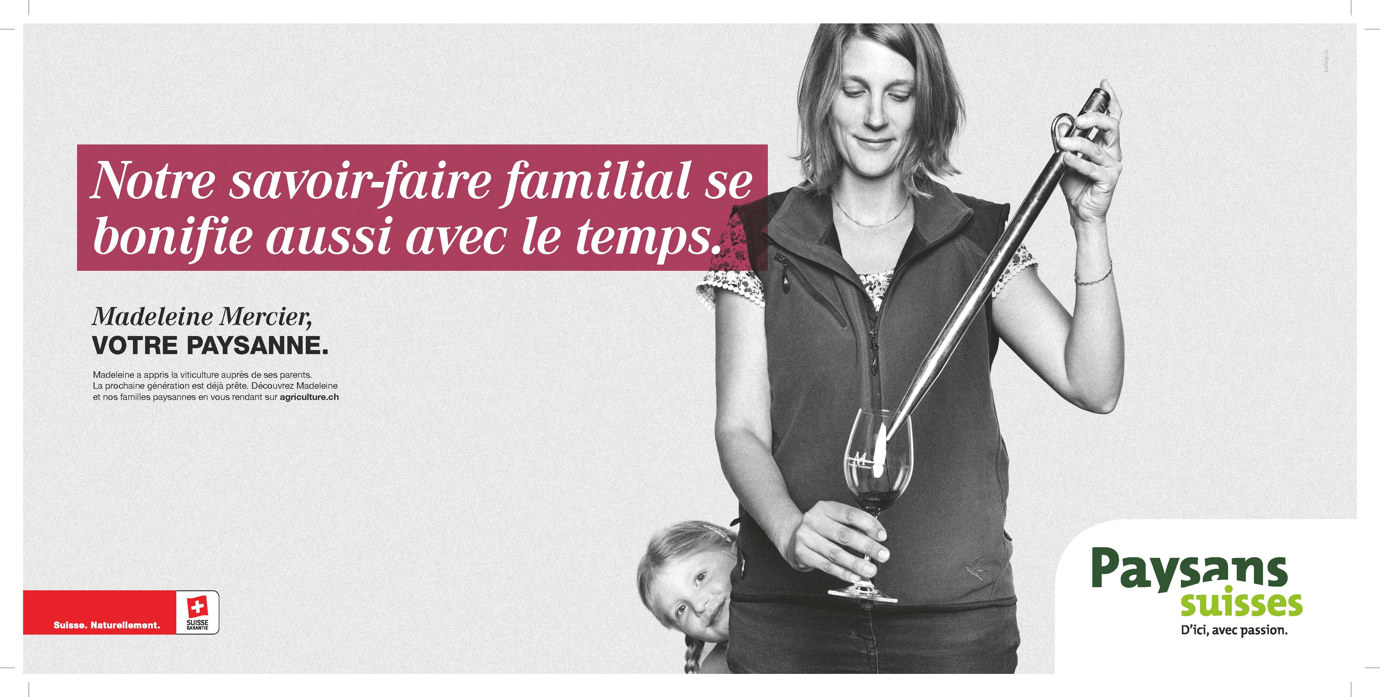 Ainsi, en Suisse romande, après Tècle Lachat (Courcelon / JU), Pascal Rossy (La Chaux / VD), Johan Viret (Villars-Tiercelin / VD), Sara et Laurent Vulliamy (Goumoens-la-Ville / VD), c’est au tour de la viticultrice et œnologue valaisanne Madeleine Mercier d’entrer en scène. La campagne d’image «Paysans suisses» est placée sous l’égide de la communication de base de l’Union suisse des paysans.